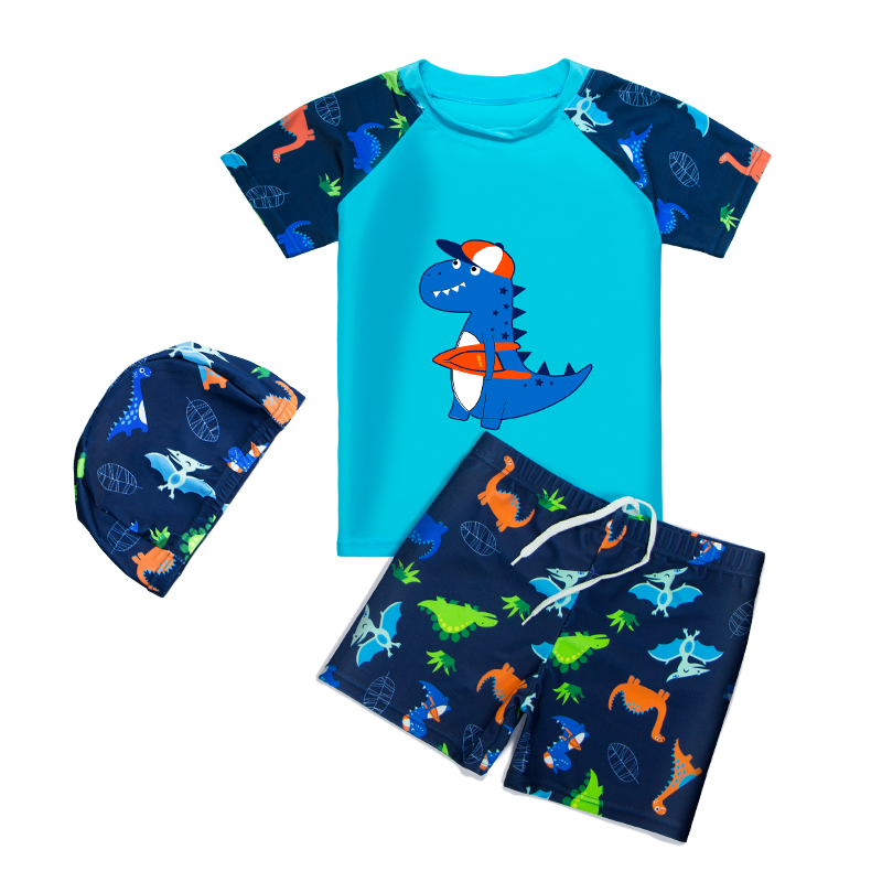 A charming blue dinosaur swim set for kids featuring playful dinosaur prints that add a whimsical touch. The set includes a comfortable swim top and matching bottoms, ensuring a delightful and adorable look for your little one's waters adventures.