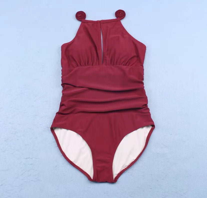 The burgundy one-piece plus size swimsuit features a flattering design with ample coverage, offering support and comfort. The deep burgundy hue complements the wearer, and the suit is thoughtfully crafted to enhance confidence and style.