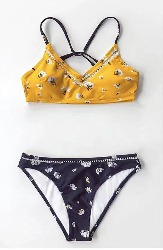 The ensemble consists of a vibrant yellow top adorned with a charming floral pattern, paired elegantly with black bottoms featuring a matching floral design. This combination creates a visually appealing and stylish two-piece swimsuit, blending the boldness of yellow with the sophistication of black in a floral-themed ensemble perfect for sunny days by the water.