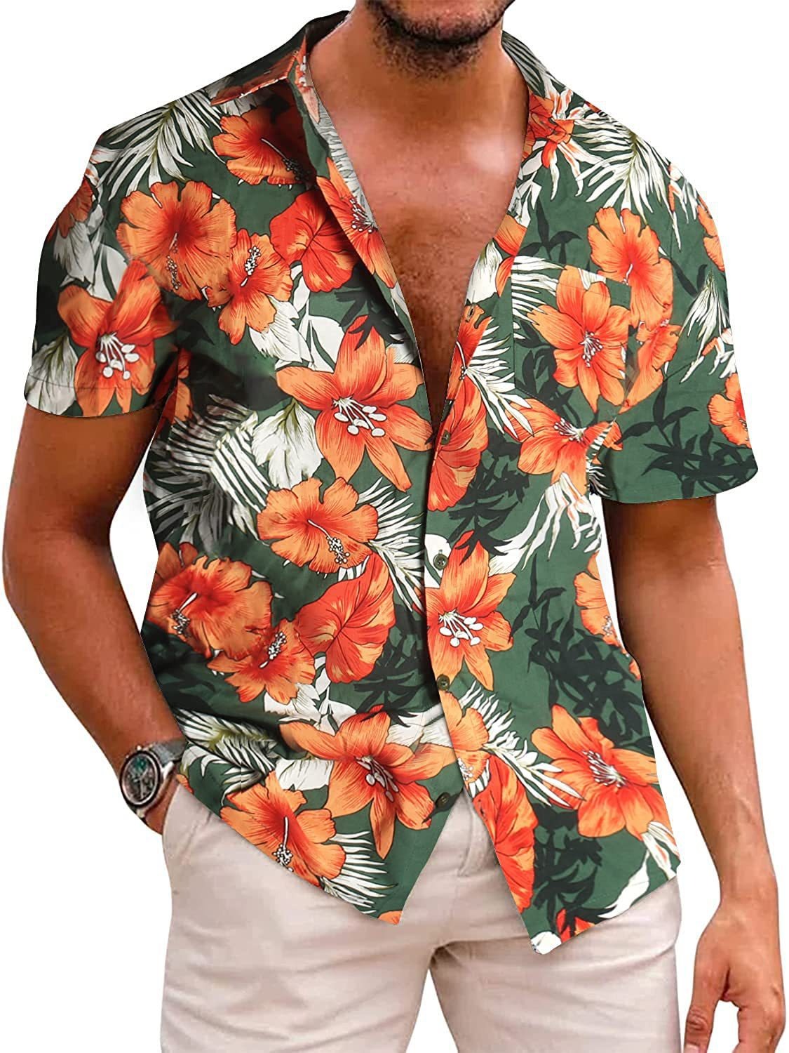 An Orange and Green Floral button-up shirt is a casual and stylish piece of clothing. It features a vibrant design with orange and green flowers, typically with buttons down the front. This shirt is perfect for a relaxed and fashionable look, suitable for various occasions, adding a pop of color and flair to your outfit.