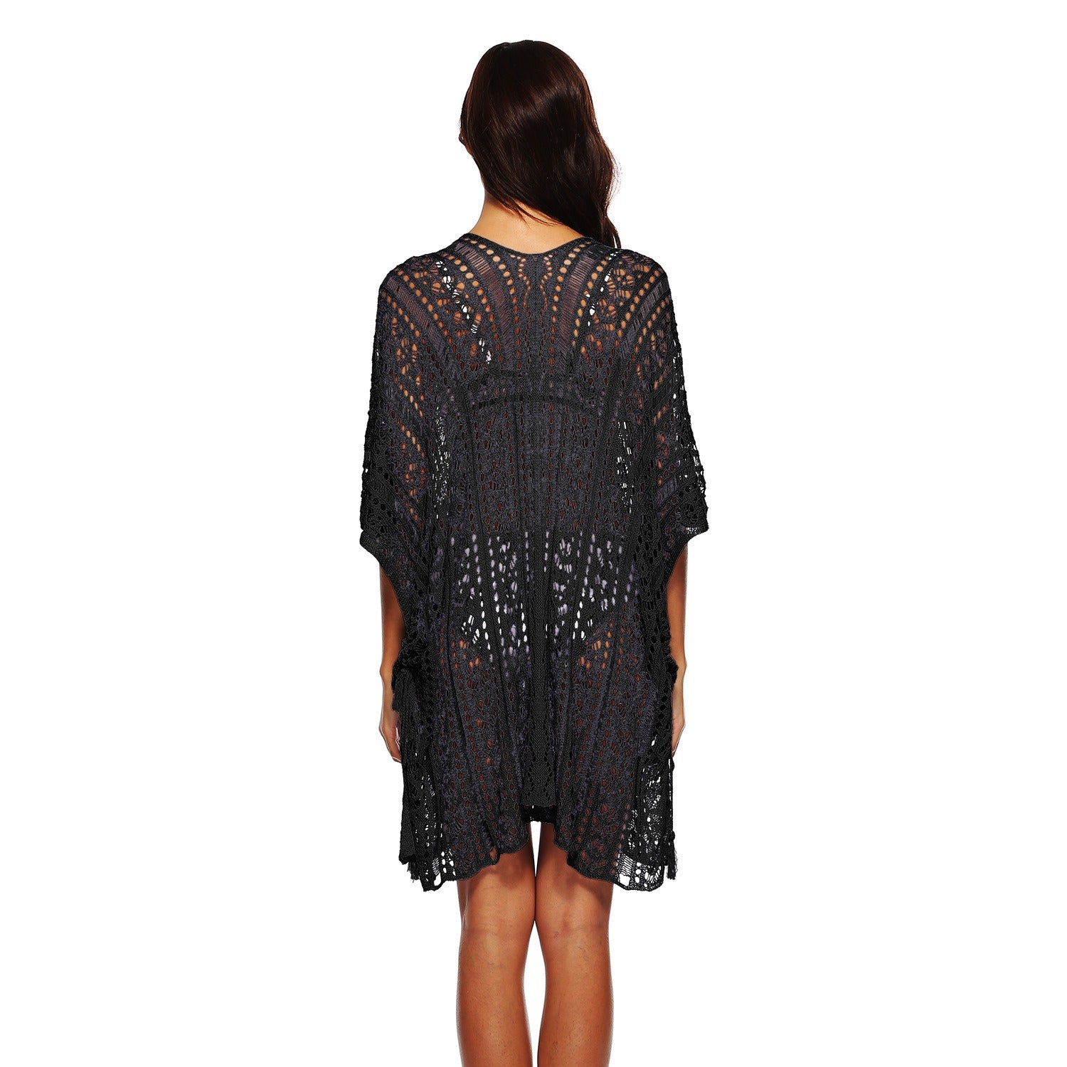 A black short, see-through dress cover-up is a chic and translucent garment designed to be worn over swimwear. This brief, sheer dress adds a stylish layer, providing a flirty and alluring look while allowing the swimsuit to peek through. It's a fashionable choice for a lightweight and trendy beach or poolside cover-up.