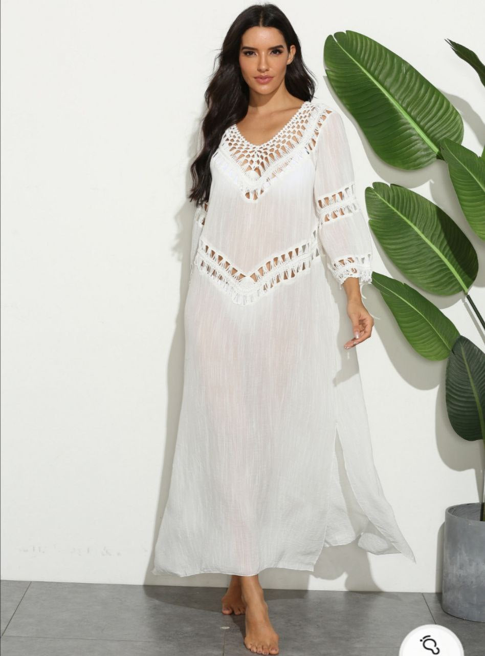 The White Long-Sleeved Semi-Sheer Ankle-Length Coverup exudes effortless elegance and sophistication for your beach or poolside outings. Crafted from lightweight, semi-sheer fabric, this coverup offers just the right amount of coverage while keeping you cool in the sun. With its long sleeves and ankle-length design, it provides a graceful silhouette, perfect for layering over swimwear. Whether worn open or cinched at the waist, its versatile style complements any swimsuit, adding a touch of chic refinement to your ensemble.