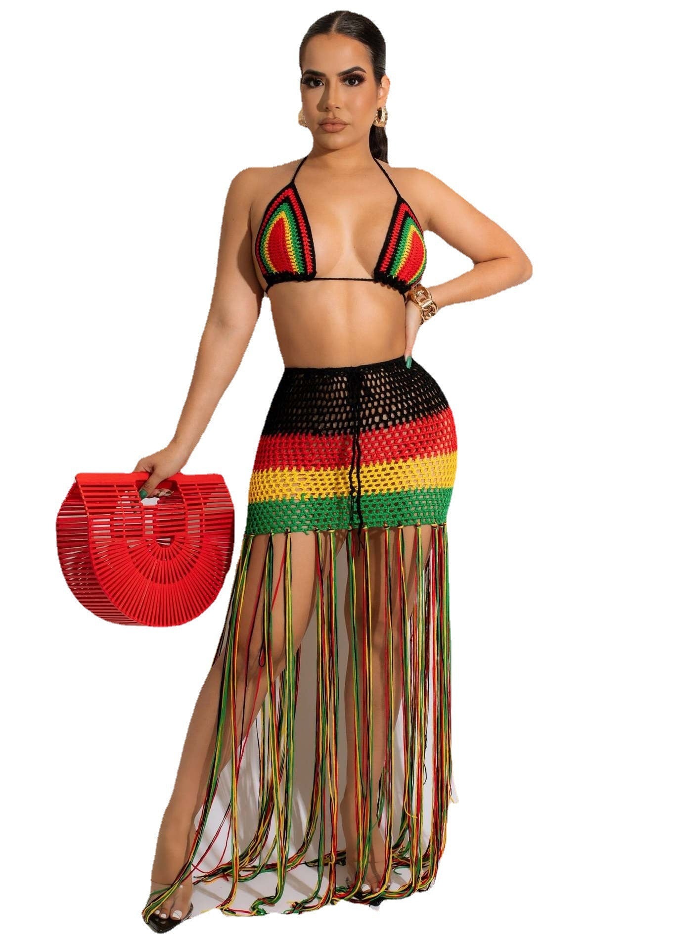 A two-piece cover-up set with a bra top and a long see-through skirt is a stylish and alluring beach ensemble, offering a blend of modern fashion and a touch of elegance for a captivating look by the water.