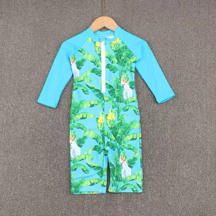The Blue Parrot One Piece for kids is a fun and vibrant swimsuit featuring a playful parrot design against a bright blue background. This adorable one-piece offers both style and comfort for young swimmers, making it perfect for sunny days at the beach or pool.