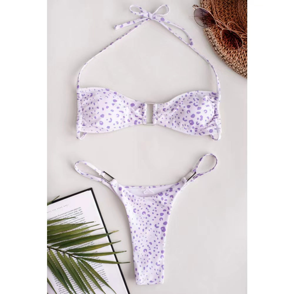 The two-piece swimsuit with purple dots is a playful and stylish swimwear ensemble. Featuring a classic bikini top and matching bottoms adorned with vibrant purple dots, this set adds a fun and whimsical touch to your beach or poolside look, perfect for enjoying sunny days with flair.