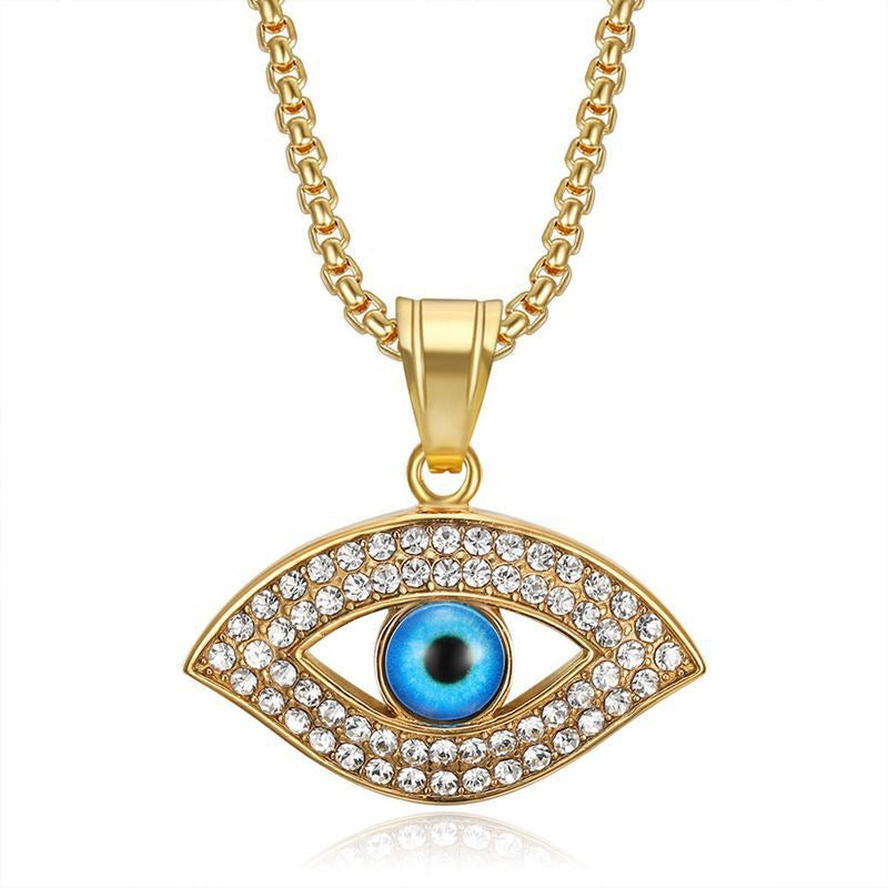 The Gold All Seeing Blue Eye Pendant is a captivating accessory that symbolizes protection and intuition. Crafted from polished gold, it features a striking blue eye design that embodies the concept of the "evil eye," providing a sense of security and warding off negativity. This elegant pendant adds a touch of mystique and style to any outfit, making it a perfect statement piece for everyday wear or special occasions.