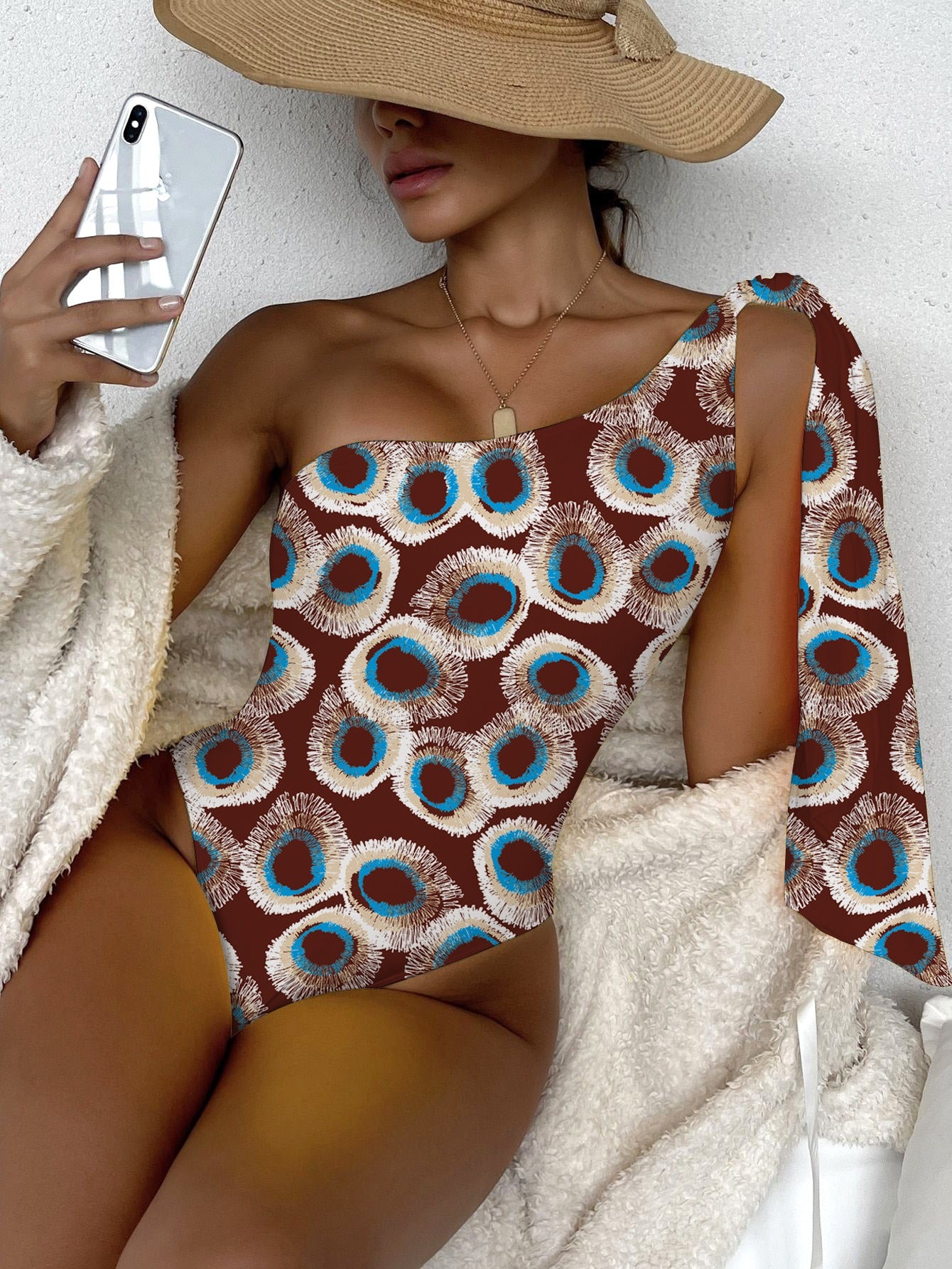Sol One Shoulder Ribbon One Piece Russet with Blue Circles