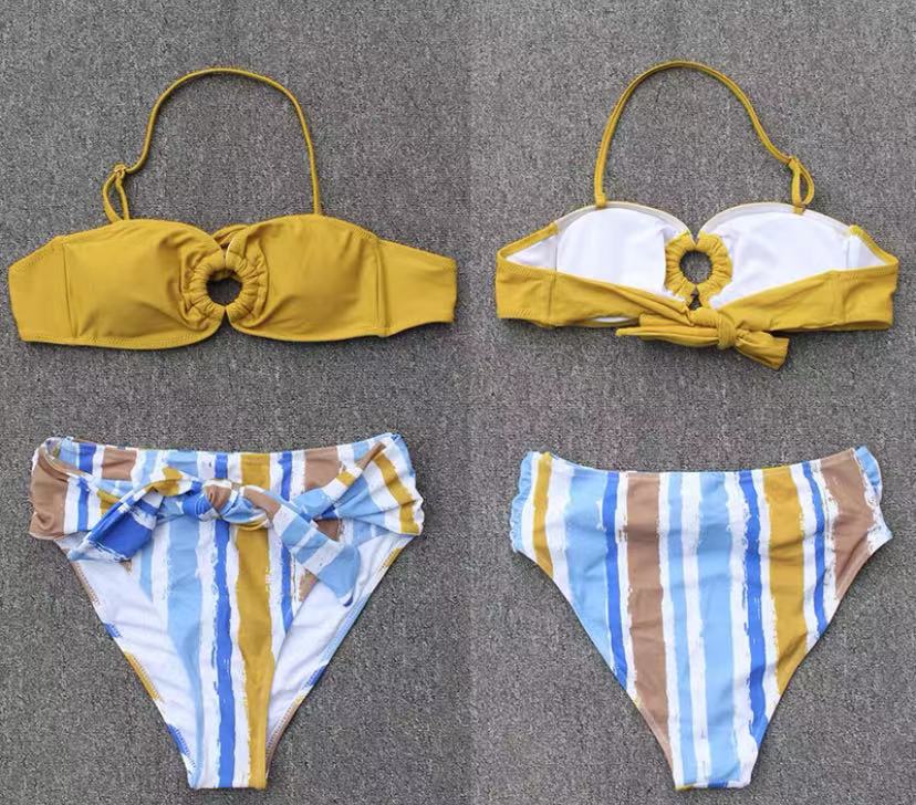 A two-piece swimsuit with a high-waist panty offers a stylish and flattering silhouette. The high-waisted design of the panty provides ample coverage and tummy control, creating a smooth and streamlined look. Paired with a coordinating bikini top, this swimsuit ensemble balances fashion and functionality. It's perfect for those who prefer a bit more coverage without sacrificing style, making it a versatile choice for poolside lounging or beach outings.